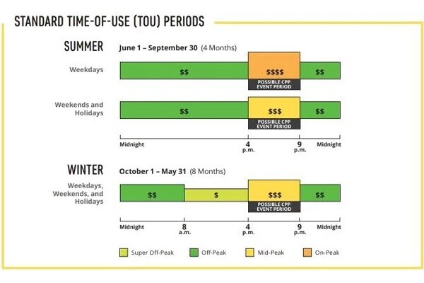C&I ratepayers are billed according to specific rate schedules, which can significantly influence the total cost. Understanding your business's rate schedule, often denoted by codes (for example., A-1, B-3, TOU-GS-2), is crucial as it impacts the calculation of demand and energy charges. For example, Southern California Edison (SCE) lays out its Business Rate Basics for Small-Sized Business Customers. SCE business customers with demands of 20 kilowatts (kW) or less are eligible for their Rate Schedule TOU-GS-1. Critical Peak Pricing is also an option for business customers, whereby customers can leverage a discount on summer electricity rates in exchange for higher prices during 12 - 15 CPP events per year, based on the following time of use schedule.
